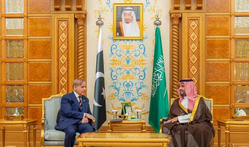 وزیرِ اعظم محمد شہباز شریف نے ریاض میں سعودی ولی عہد محمد بن سلمان سے خوشگوار ماحول میں ملاقات کی۔
