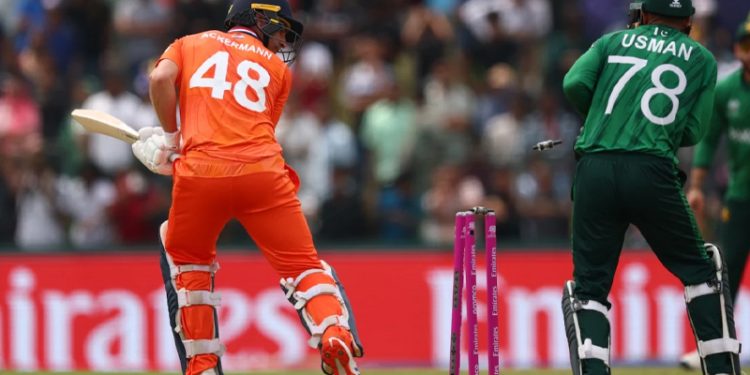 نیدرلینڈز کی پہلی وکٹ 28 رنز پر گری جب میکس او ڈاؤڈ سلمان مرزا کے بال پر کیچ آؤٹ ہوگئے جبکہ اس کے بعد مائیکل لیوٹ محمد نواز کی گیند پر 24 رنز بناکر آؤٹ ہوئے۔