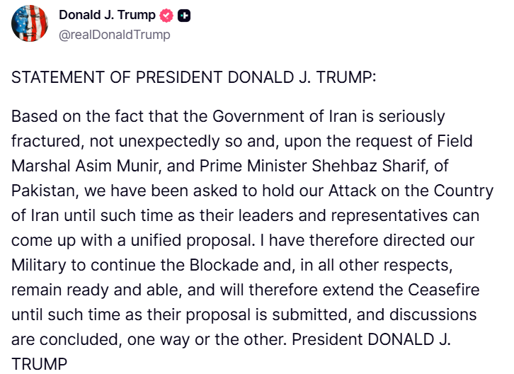 انہوں نے مزید کہاکہ جنگ بندی میں بھی توسیع کی جا رہی ہے، جو اس وقت تک برقرار رہے گی جب تک ایران کی جانب سے کوئی حتمی تجویز پیش نہیں کی جاتی اور مذاکرات کسی نتیجے پر نہیں پہنچ جاتے۔